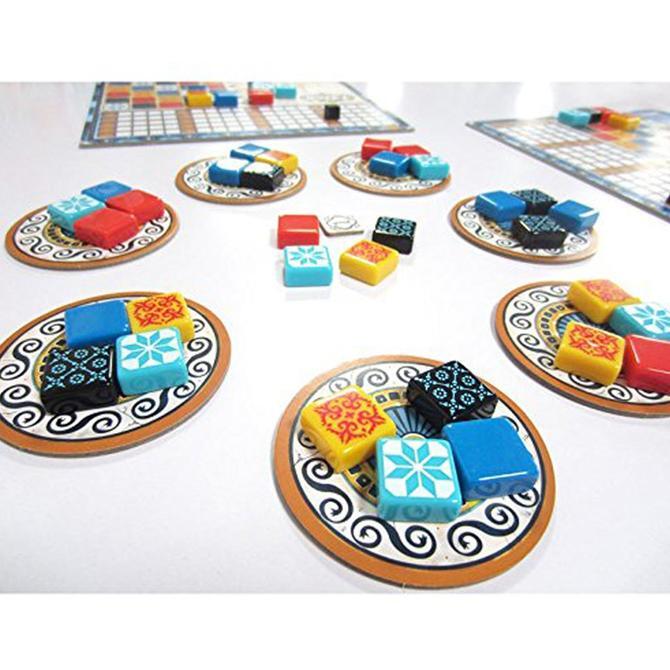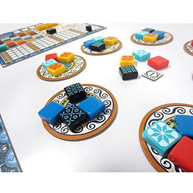 In the game Azul players take turns drafting coloured tiles from suppliers to their player board. Later in the round, players score points based on how they've placed their tiles to decorate the palace. Extra points are scored for specific patterns and completing sets; wasted supplies harm the player's score. The player with the most points at the end of the game wins.