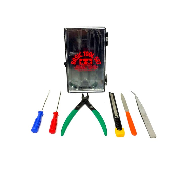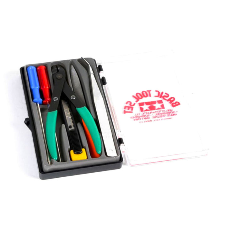 This tool set is great for the model enthusiast. It contains the basic, indispensable tools for model and craft work. A pair of side cutters for plastic, angled tweezers, small (+) and (-) screwdrivers, a craft knife and a file. Come neatly packed in a handy plastic case.