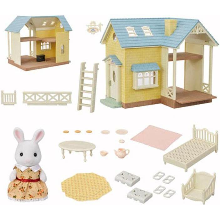 Inside there's a log burning stove, and the upstairs makes a cute attic bedroom for your visiting family. The gift set also includes a bed, plus an armchair & table set, plus white rabbit sister figure.