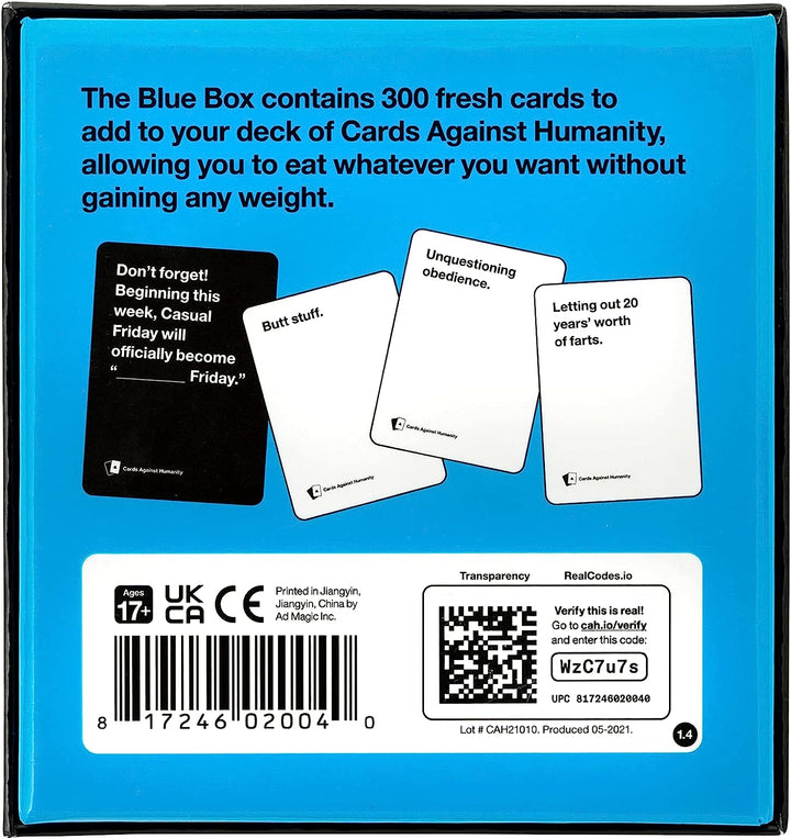 The Blue Box comes with 300 fresh cards to add to your deck of Cards Against Humanity, allowing you to eat whatever you want without gaining any weight.