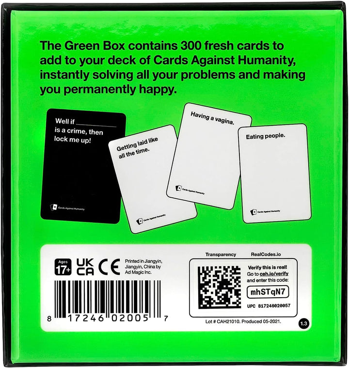The Green Box comes with 300 fresh cards to add to your deck of Cards Against Humanity, instantly solving all your problems and making you permanently happy.