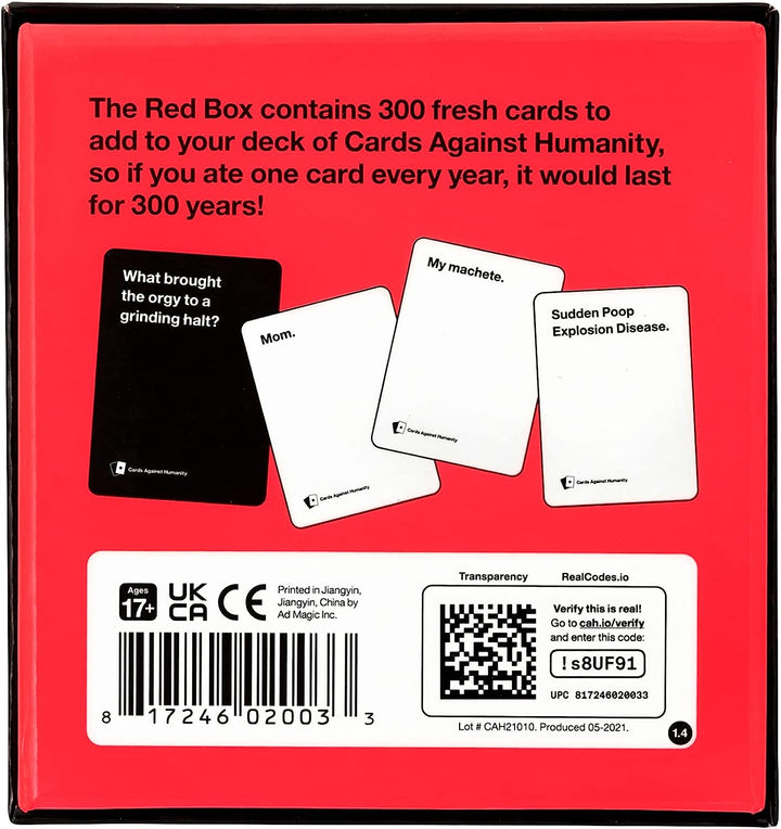 The Red Box comes with 300 fresh cards to add to your deck of Cards Against Humanity, so if you ate one card every year, it would last for 300 years!