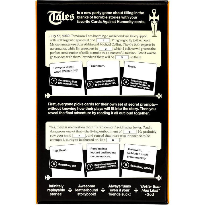 Tales is a storytelling-based party game that incorporates cards from Cards Against Humanity.