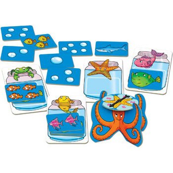 Spin the spinner, count the number of bubbles and collect the matching cards on your fish board. But watch out! If you turn over a shark card, it will eat all of your fish and you'll have to start again! The player with the most fish at the end of the game is the winner!