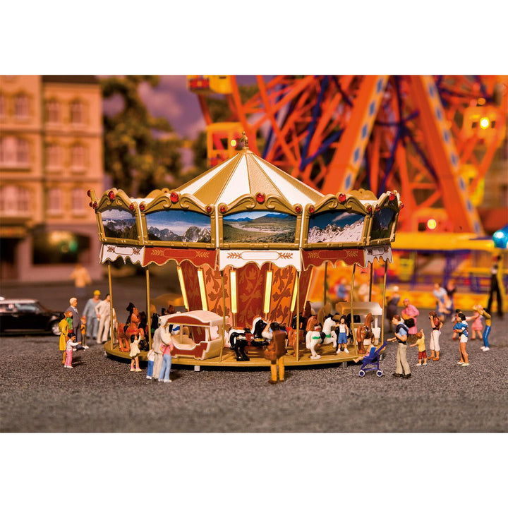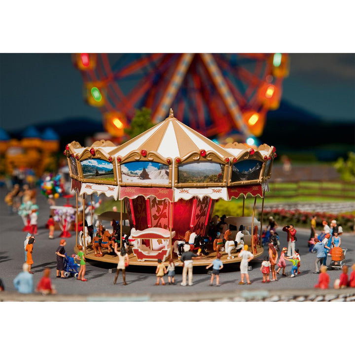 Undoubtedly the classic among vintage merry-go-rounds. Roof with elaborate mirrors, complete with driving motor (12-16 V, AC voltage).