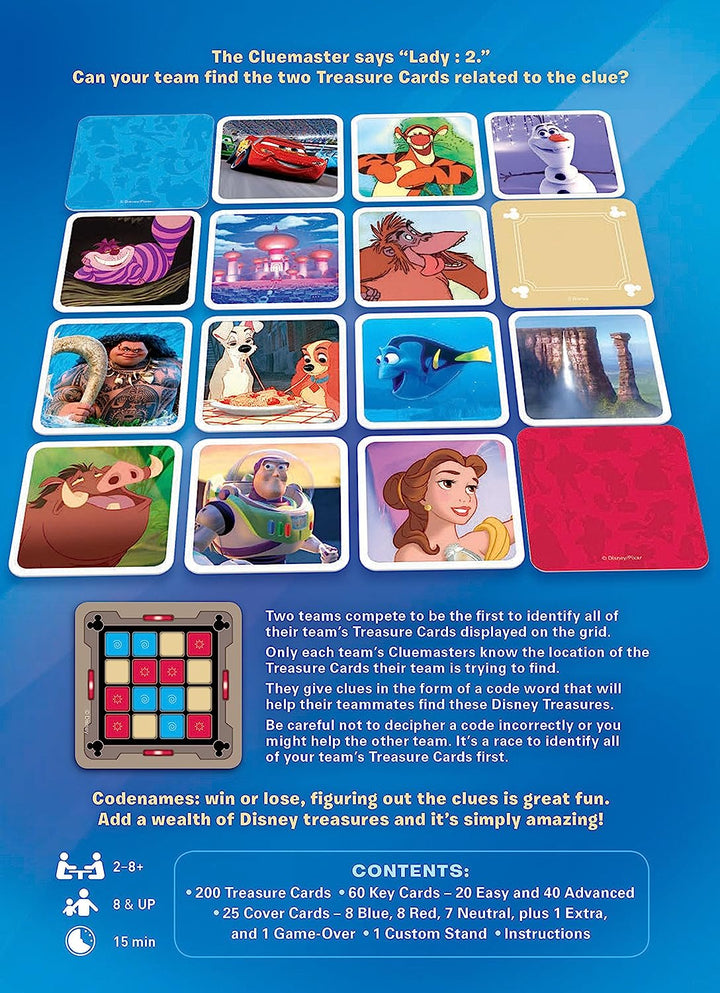 The Disney Family Edition of Codenames combines the hit social word game with some of Disney's most beloved properties from the past 90 years. Two Cluemasters give one-word clues to help their teammates identify the Disney characters, locations, and items from a 25-card game grid. Including both pictures and words, it's family fun for Disney fans of all ages.