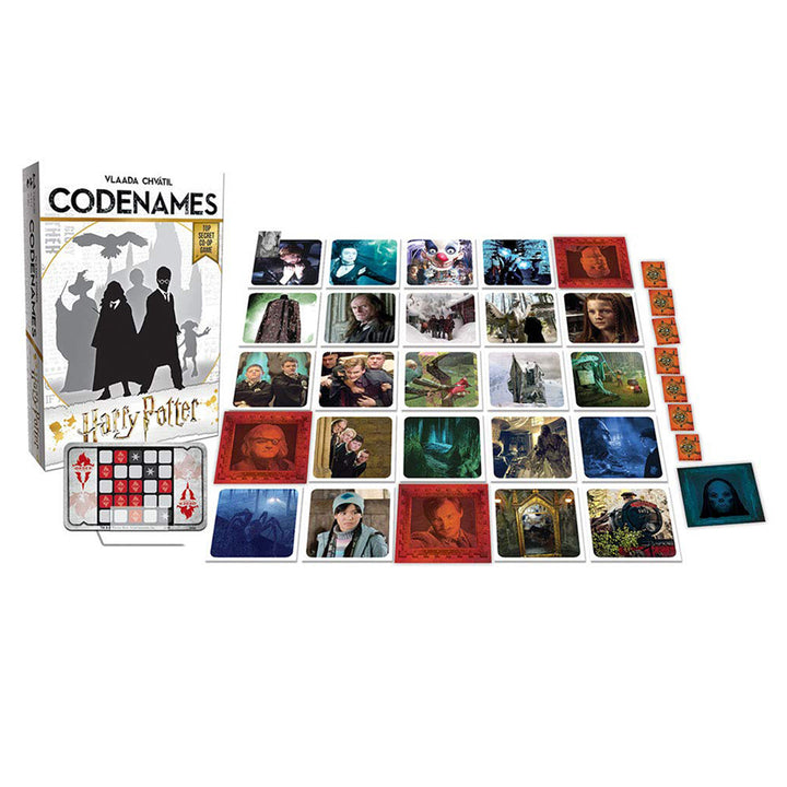 Codenames: Harry Potter is a fun, easy-to-learn cooperative word and picture deduction game for Harry Potter fans of all game levels. Players help their teammates locate secret agents who are concealed among a grid of Harry Potter references. Use only one-word clues to guide guessers to the right spots, or hidden Death Eaters will cost them the win. This co-op game is a great challenge for Harry Potter fans of all levels. Work together with multiple players on each team to increase your chances of locating all of the secret Agents.