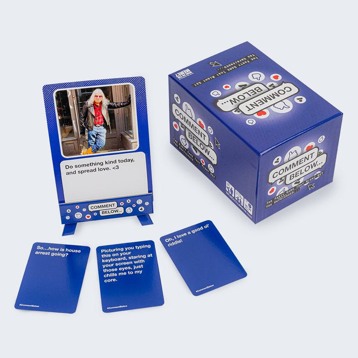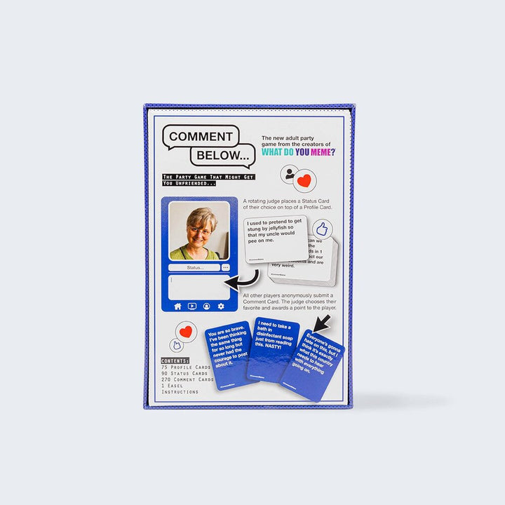The party game where everyone is an internet troll. Players compete to match their funniest comment card to an absurd social media status. Includes 75 profile cards, 150 status cards, 300 comment cards, Easel. Ages: 17+