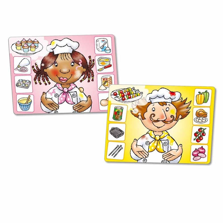 In this fun food-themed game, each player picks a chef board with a different recipe - from lasagne to cupcakes - and matches the ingredient cards to their board. They must then spin the spinner to get their plate and wait for their meal to cook! Who will be the first to serve up a tasty treat?