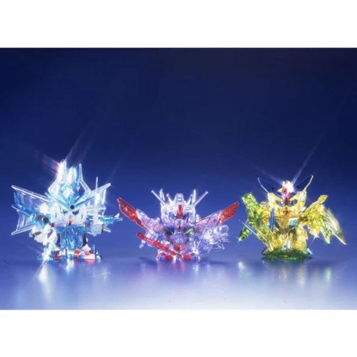 This re-release of the classic 1994 plastic kit set features three snap-fit Gundam Formulars--Super Dragon Guardian Formulandar Jr., Captain Formular 91 Jr., and Captain Neo Gundam Jr.--molded in clear color. Super Dragon Guardian Formulandar Jr. is transformable into Super Gun-Dragon, Captain Formular 91 Jr. is transformable into Star Griffon, and Captain Neo Gundam Jr. is transformable into Great Burst Phoenix Mode. Each li'l mecha comes with its weaponry, and foil stickers are provided for detail. Also included in this set is a "Gundam Chi-Bi-Senshi Comic World Special 2" three-page comic, Chi-Bi frame strengthening foil stickers, and a sheet of SDV jumbo special stickers.
