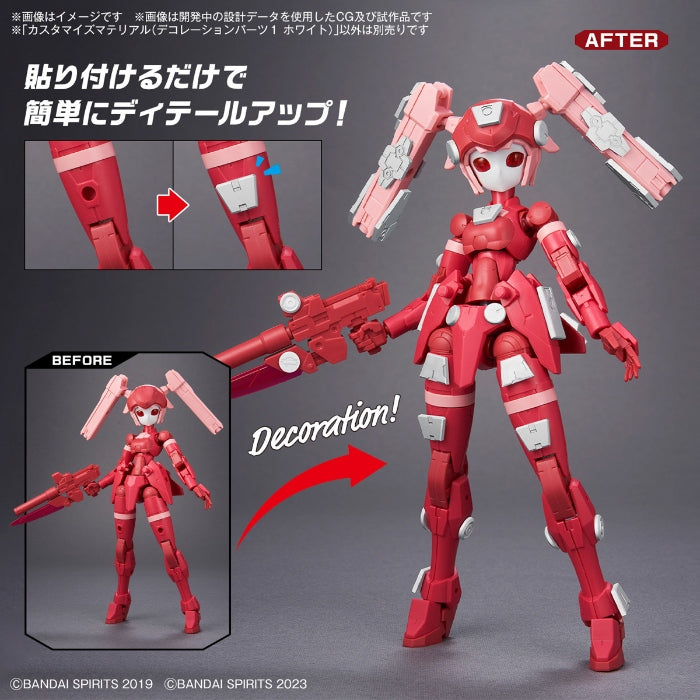 Bandai adds a set of new decoration parts to their "30MM" (30 Minutes Missions) model-kit lineup! They're very simple to use, so even beginners can easily add details to their kits! They're made in a highly versatile white color; you can use them to cover the unused joint holes on your kit to increase the density of the armor. The detailed mold expression of each part adds a mechanical feel; they're available in both round and square shapes, and attach easily with an exclusive adhesive sticker. Order yours today!