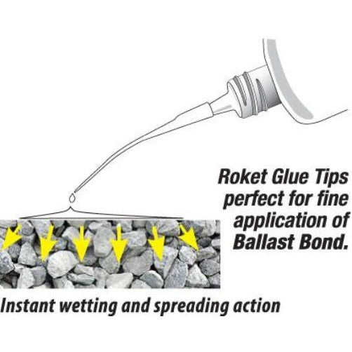 Instructions: Position ballast or scatter to track or scene. Gently apply Ballast Bond from bottle. Fine Roket Glue Tips that are available separately aid application. Adjust if required. Allow to dry.