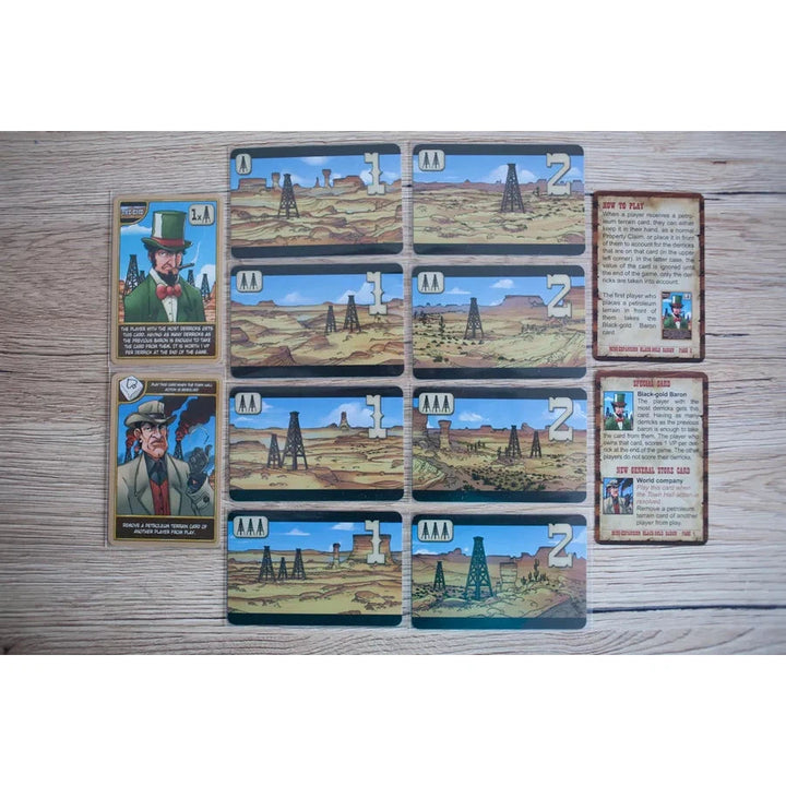 The Dice Town: A Fistful of Cards offers a new mechanism centered around the titles of property. Only the player in possession of the greatest number of derricks will be able to claim the title of Baron of the black gold.