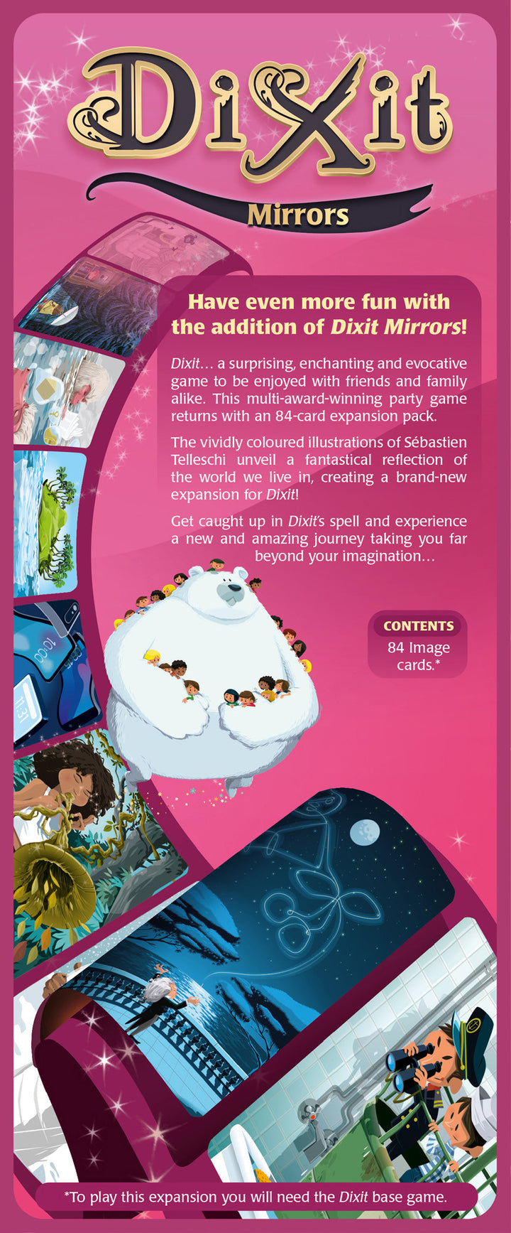 With Dixit Mirrors, reveal and explore new facets of the oniric world of the range. The vividly-colored illustrations created by Sébastien Telleschi unveil a fantastical reflection of our society, to create a brand new expansion for Dixit. These cards can be used along with or as a replacement of those from your Dixit base game (or Dixit Odyssey) or previous Dixit expansions.