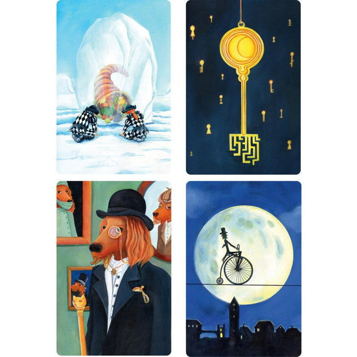 Dixit Odyssey contains 84 new cards, each with a unique image drawn by Pierô and colored by Marie Cardouat, artist of Dixit and Dixit 2. This stand alone version also includes a folding game board, 6 new rabbit scoring tokens (12 total), and a box large enough to hold all the Dixit cards released to date. The stand alone version of Dixit Odyssey includes enough components for up to twelve players and also has variant rules for team play and for new ways to play with the cards.