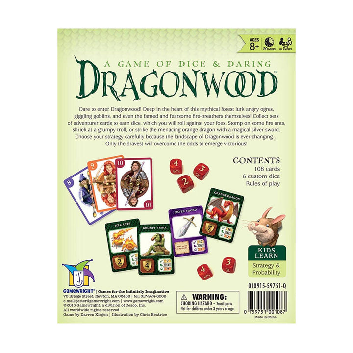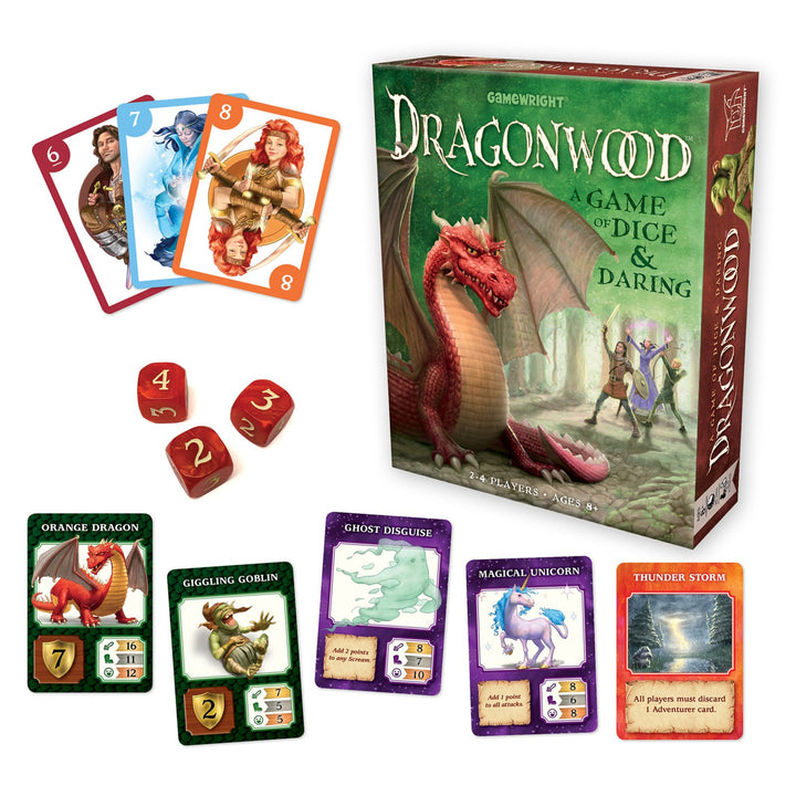 Dare to enter Dragonwood! Deep in the heart of this mythical forest lurk angry ogres, giggling goblins, and even the famed and fearsome fire-breathers themselves! Collect sets of adventurer cards to earn dice, which you will use to roll against your foes. Stomp on some fire ants, shriek at a grumpy troll, or strike the menacing orange dragon with a magical silver sword. Choose your strategy carefully because the landscape of Dragonwood is ever-changing. Only the bravest will overcome the odds to emerge victorious! It may be hard to imagine, but Dragonwood, with its vast array of richly illustrated cards, started out looking much different than where it ended. Inventor Darren Kisgen submitted a prototype without a single illustration - just simple words and numbers written in marker on blank white cards. Well apparently that's all was needed, because within moments, our play testers were enraptured with the simple-to-learn but deeply engaging fantasy-themed game. Illustrator Chris Beatrice beautifully captured the wit and humor depicted in Darren's words to create one of our most visually appealing games.
