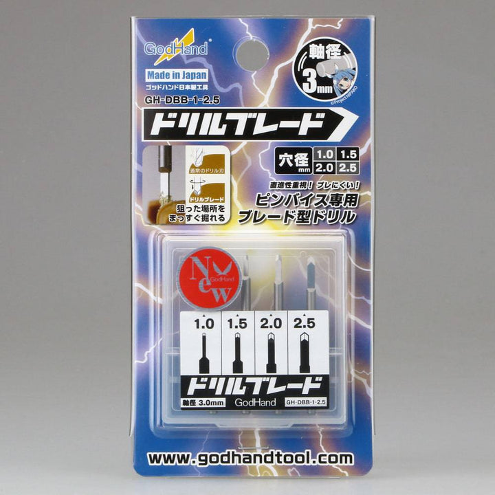 The GodHand GHDBB125 is a pin vise operated drill bit set designed for fine detail work such as scale modelling, miniatures and other micro drilling tasks where highly accurate, clean holes are the desired end result. Avoid lateral force in operation, as it may break the tapered portion of the drill bit. Perfect for tasks such as drilling out weapon barrels on plastic model vehicles or mechas