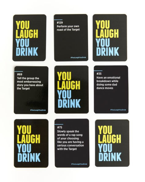 YOU LAUGH, YOU DRINK includes 200 prompts on 100 cards that will make you laugh, then make you tipsy. Keep a straight face, or bottoms up.