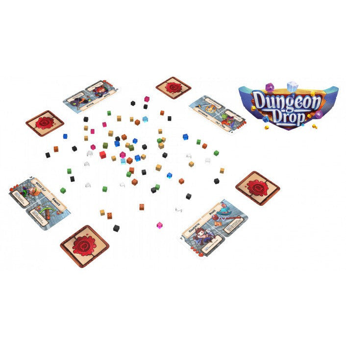 Instant Dungeon... Infinite Possibilities! Gather your gear and prepare to dive into the labyrinth! Teeming with untold treasure, the tunnels are said to be inhabited by unusual creatures, both adorable and terrible. Keep your wits about you as the very walls shift in the torchlight... ...it's time to drop into the dungeon! --- Dungeon Drop is a lightweight dungeon crawler for 1-4 players, featuring unique gameplay elements that assures no two games could possibly be the same. Dungeon Drop blends strategy with a novel spatial element that will challenge casual and hardcore gamers alike! At the start of each game, cubes of varying colors, representing both loot and monsters in the dungeon, are dropped onto the table from a height of 6 to 12 inches. This creates a dungeon layout with infinite possibilities. You will then use your customized hero to explore the dungeon, use your unique abilities, and ultimately loot a room that won't kill you!