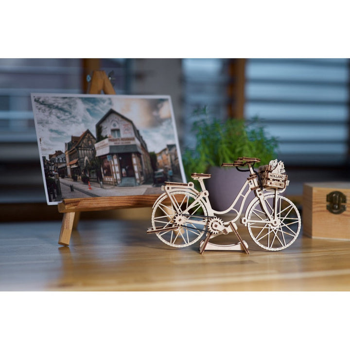 The Ugears Dutch Bicycle model, from the World Cities collection, is a classic bike with rear rack and front basket for doing your shopping, or for taking a friend or pet for a ride. Small models of a cat, dog, and flowers are included and can be placed in the basket. A rear kickstand and display mount allow the bike to stand upright for display. The model also features rotating pedals with a rubber chain that drives the rear wheel, a freely rotating front wheel, and moving handlebars. With 75 pieces made of art-quality composite wood, Ugears' DIY Dutch Bicycle is rated "Easy" and can be built in about 90 minutes. You won't need glue or special tools to build this 3D puzzle, just push the pieces out of their laser pre-cut boards and snap them together. Illustrated instructions in 11 languages (English, German, Ukrainian, French, Polish, Spanish, Portuguese, Japanese, Italian, Chinese and Korean) guide your build. Perfect for display on a shelf or table in your home or office.