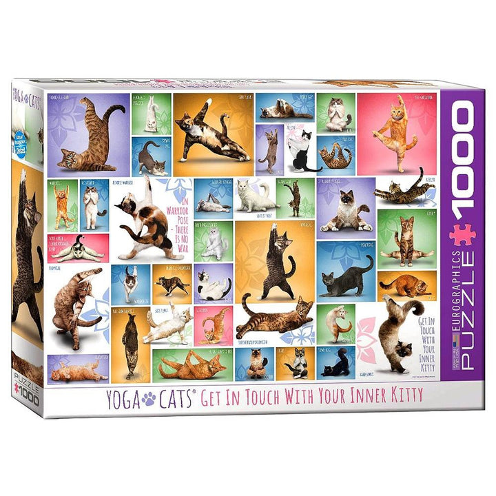 EuroGraphics Yoga Cats 1000-Piece Puzzle. Discover some of the basic yoga positions with the help of your purring friends. EUROGRAPHICS puzzles are both fun and educational. Puzzle pieces are made from 1.75mm blueboard, and are 100% recyclable, and printed with vegetable-based inks. Box size: 10" x 14" x 2.37". Finished Puzzle Size: 19.25" x 26.5".