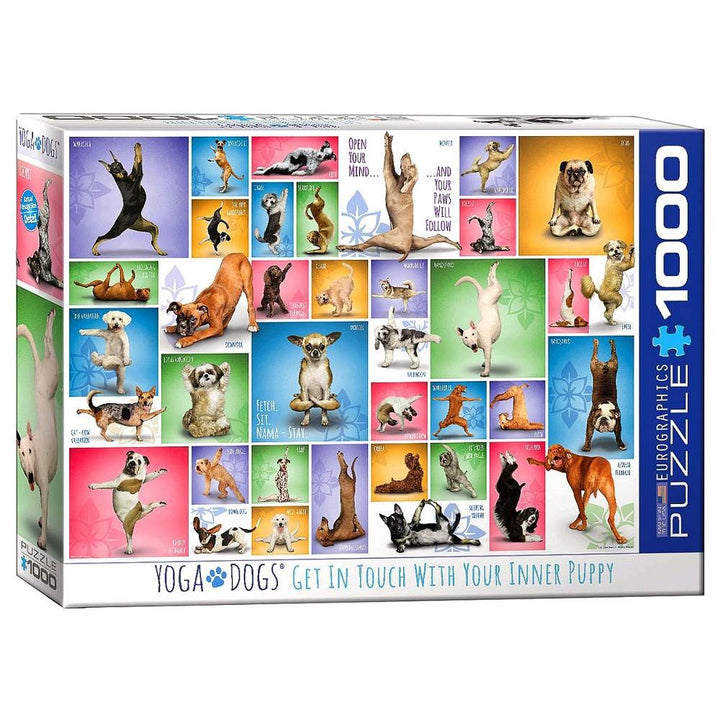 EuroGraphics Yoga Dogs 1000-Piece Puzzle. Discover some of the basic yoga positions with the help of your furry friends. EUROGRAPHICS puzzles are both fun and educational. Puzzle pieces are made from 1.75mm blueboard, and are 100% recyclable, and printed with vegetable-based inks. Box size: 10" x 14" x 2.37". Finished Puzzle Size: 19.25" x 26.5".