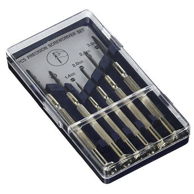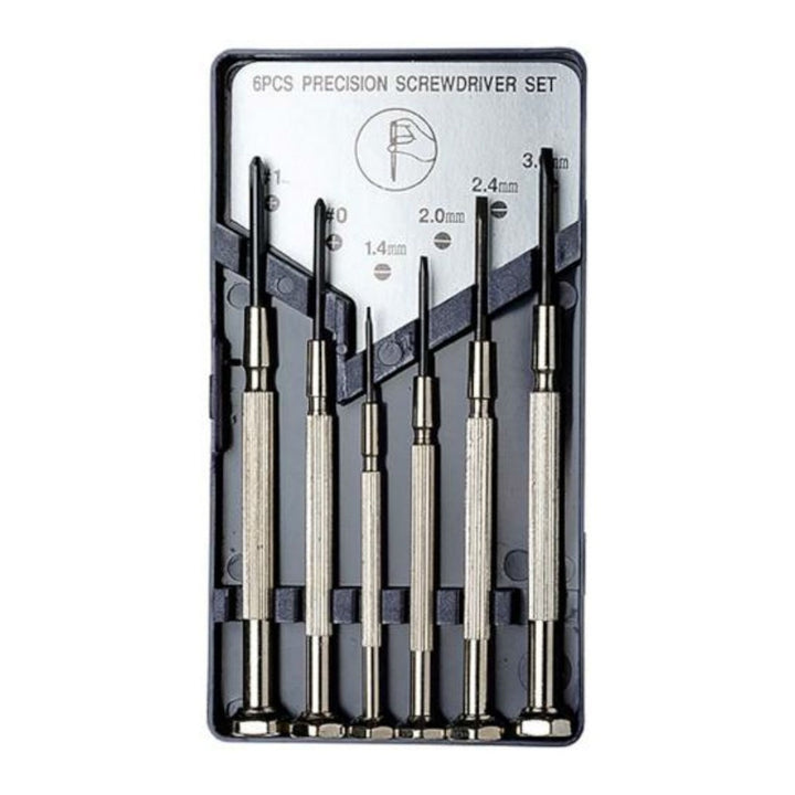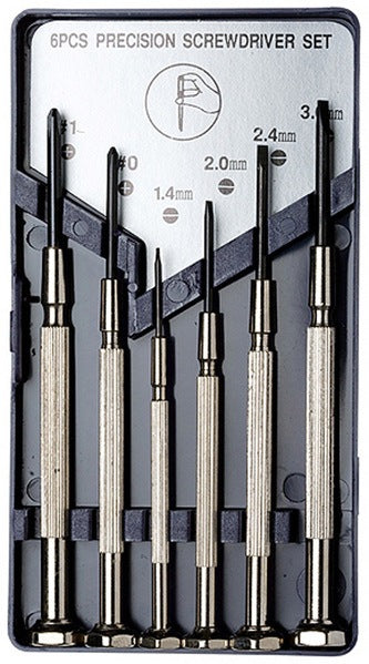Contains 4 Flat head screwdriver sizes (1.4mm, 2.0mm, 2.4mm and 2.9mm) and 2 Phillips (#0 and #1.2).