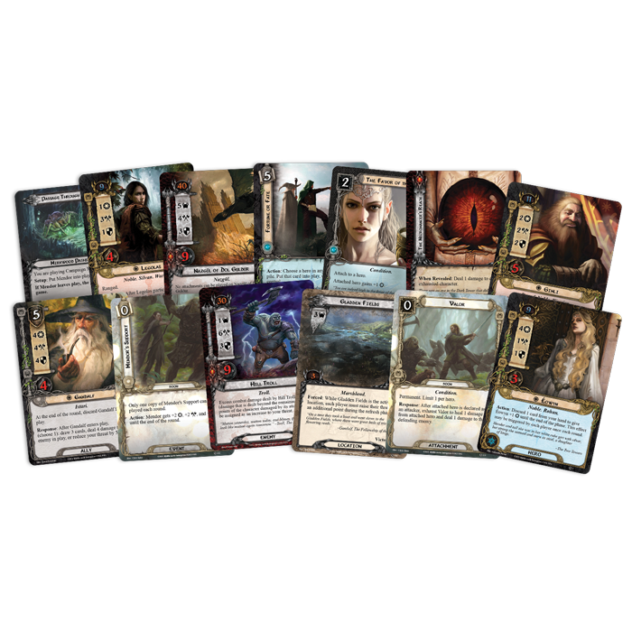 In The Lord of the Rings: The Card Game, you and your friends take on the roles of heroes attempting to complete dangerous quests. Instead of directly retelling the classic stories that have previously been narrated, this game provides you with a variety of elements—characters, settings, enemies, events, items, artifacts, scenarios—that allow you to embark upon new adventures and share new experiences with these beloved characters during this ominous period of Middle-earth's history.