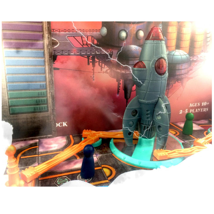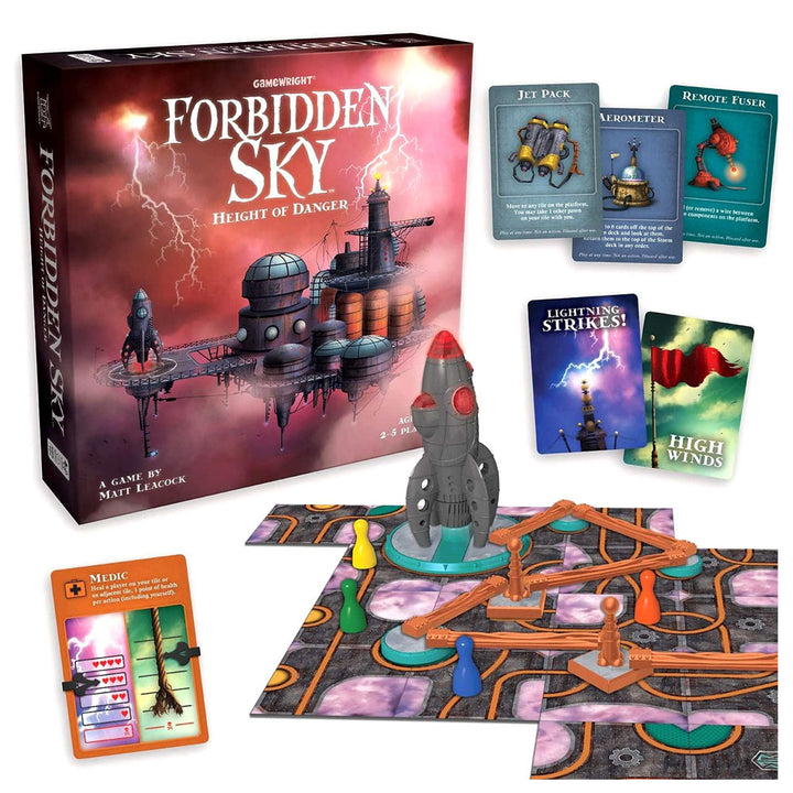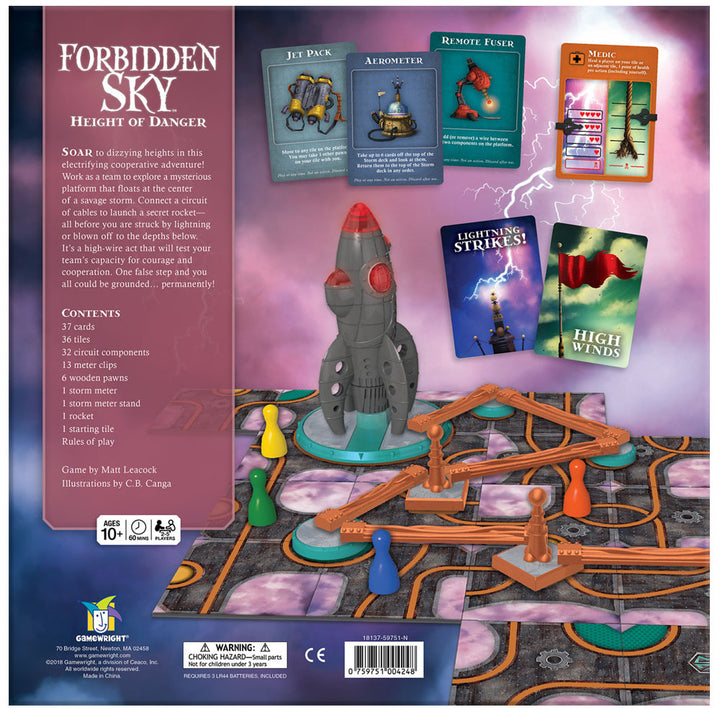 Soar to dizzying heights in this electrifying cooperative adventure! Work as a team to explore a mysterious platform that floats at the center of a savage storm. Connect a circuit of cables to launch a secret rocket - all before you are struck by lightning or blown off to the depths below. It's a high-wire act that will test your team's capacity for courage and cooperation. One false step and you all could be grounded… permanently! Contents: 37 tiles, 36 cards, 32 circuit components, 13 meter clips, 6 wooden pawns, 1 storm meter, 1 storm meter stand 1 starting grid, 1 rocket, rules of play