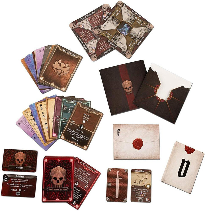 Playing through a scenario is a cooperative affair where players will fight against automated monsters using an innovative card system to determine the order of play and what a player does on their turn. Each turn, a player chooses two cards to play out of their hand. The number on the top card determines their initiative for the round.