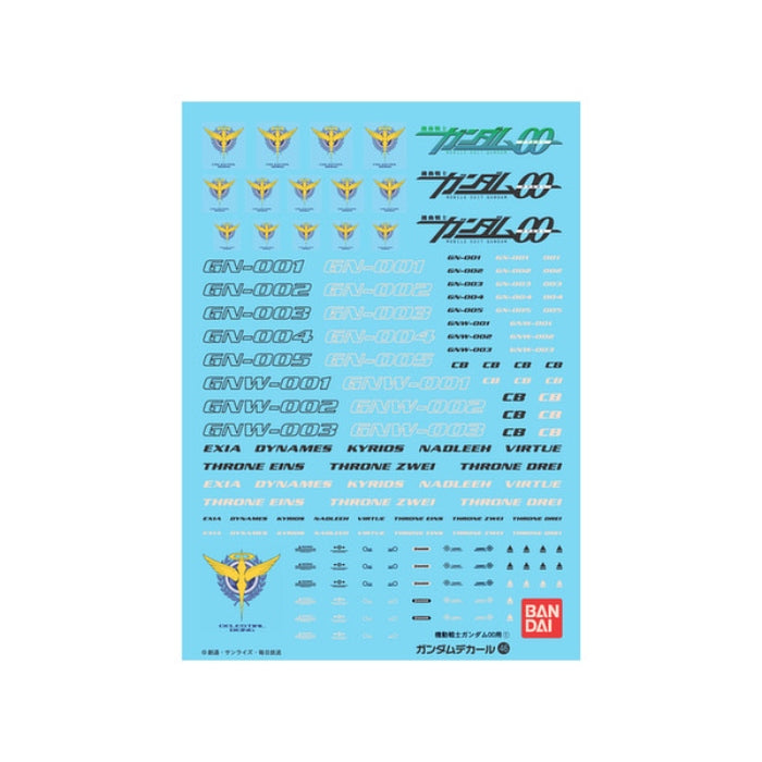 Set of water-slide decals to add custom markings to your 1/60, 1/100, and HG 1/144-scale model kits of Celestial Being Mobile Suits from "Gundam 00."