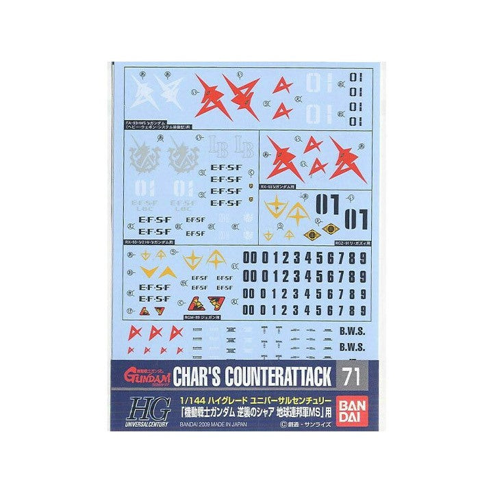 The Gundam Decal No.71 Char's Counterattack Earth Federation set comes with decals to decorate your HGUC 1/144 scale models.