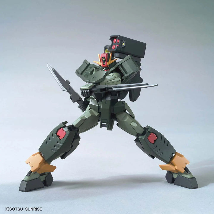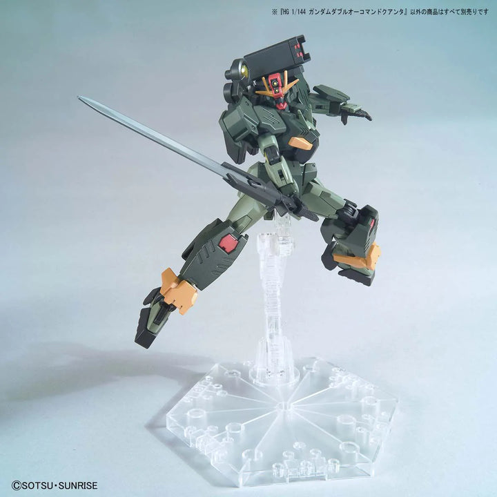 The 00 Qan[T]'s stylish silhouette has been renewed in a deep green colour, and it comes with a large number of weapons such as missile launchers, heavy machine guns, and the Arms Shield. Slashing weapons such as the command sword and double-combat knives stored in the Arms Shield are also included, and its colouring and military elements evoke the Command Gundam.