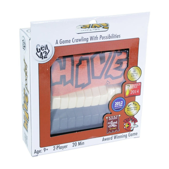 Hive is a highly addictive strategic game for two players that is not restricted by a board and can be played anywhere on any flat surface. The base game of Hive is made up of twenty two pieces, eleven black and eleven white, resembling a variety of creatures each with a unique way of moving. With no setting up to do, the game begins when the first piece is placed down. As the subsequent pieces are placed this forms a pattern that becomes the playing surface (the pieces themselves become the board). Unlike other such games, the pieces are never eliminated and not all have to be played. The object of the game is to totally surround your opponent's queen, while at the same time trying to block your opponent from doing likewise to your queen. The first player to totally surround his opponent's queen wins the game.
