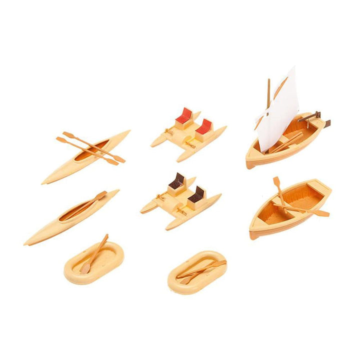 This kit includes 1 rowboat, 1 sailboat, 2 inflatable boats, 2 pedal boats and 2 canoes for the design of beach sections and water scenes.