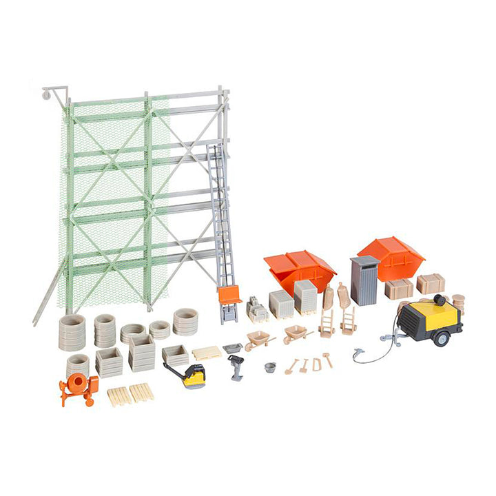 Building site decoration set with implements and machines allowing to equip a building site, such as facade scaffolding, fall arrester, cement mixer, compressor and concrete vibrator, rubble container, portable toilet cabin and plenty of other containers and tools.