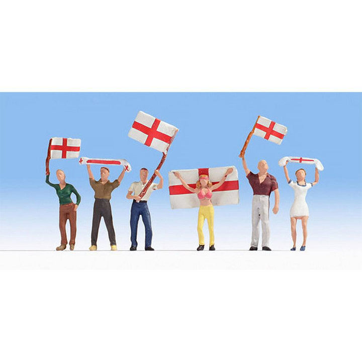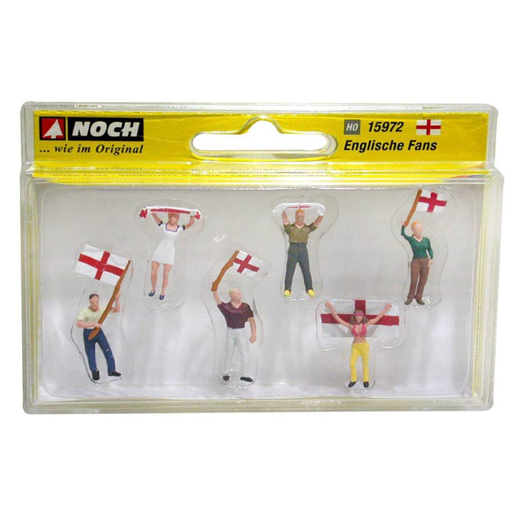 Fans should not miss in any arena or at the football field's sidelines. The "12th player" creates the atmosphere in the arena and animates the team to achieve peak performance. With the Noch set "German Fans", the model railway fan has everything he needs to create an good arena atmosphere on the model railway landscape or in the diorama. The figurines, furthermore, also shine in a crowded train, on the railway station's platforms or as pedestrians on their way to the arena with their flags and their scarfs.