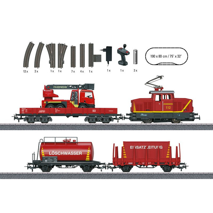 - This great starter set includes an electric locomotive, a low side car for transporting a fire department ladder truck, and a tank car.