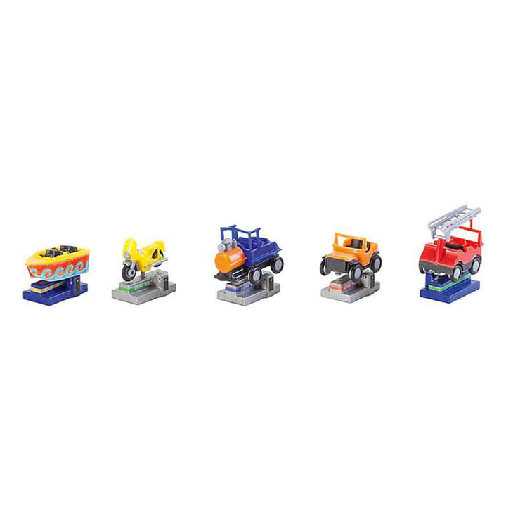Exciting chases on the motorcycle, large-scale operations of the fire department or plowing the waves with the speedboat. Put in coins and go on the adventure in one of the five rocking machines. The kit also includes a SUV and of course a locomotive.