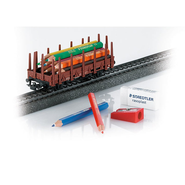 The stake car has a new car number. It has 18 fixed stakes. It also has Relex couplers. Length over the buffers 11.5 cm / 4-1/2". Included are 12 short STAEDTLER colored pencils, a STAEDTLER rasoplast eraser, as well as a STAEDTLER plastic pencil sharpener (plastic pencil sharpener may vary in color). The colored pencils serve as a car load.