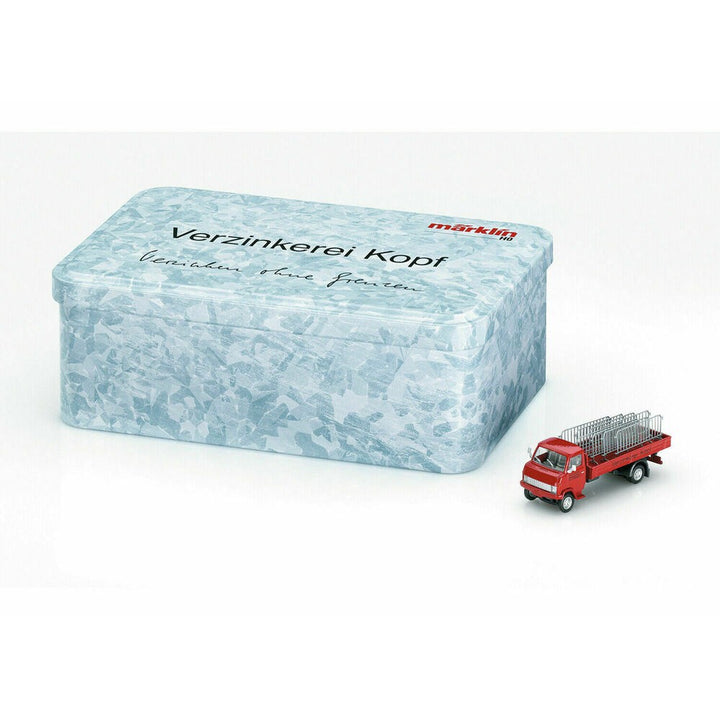 Model: The freight car has separately applied end platforms. Length over the buffers 16.1 cm / 6-3/8". A Schuco model of a Hanomag F55 truck is included. In addition, crowd barriers included can be used as a load for the Hanomag truck. Attractive packaging in a metal container, designed in the style of galvanized sheet metal. DC wheelset E700580.