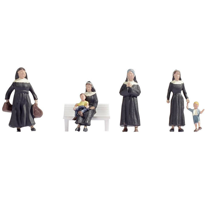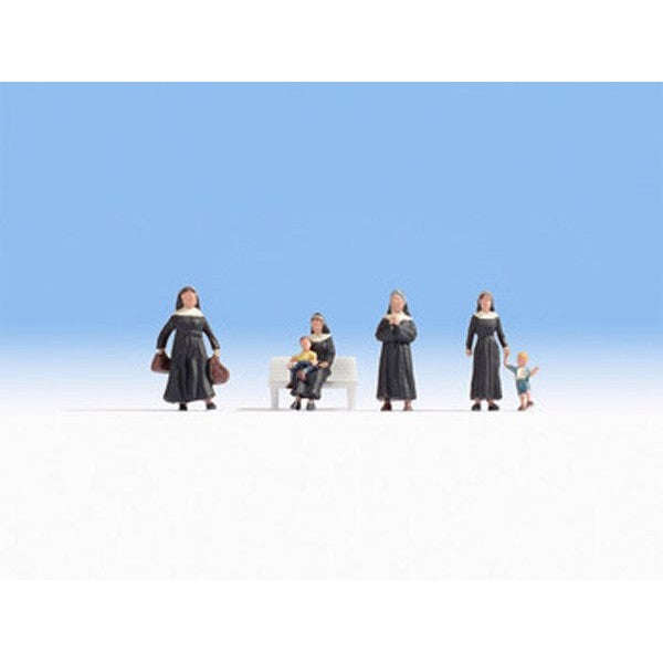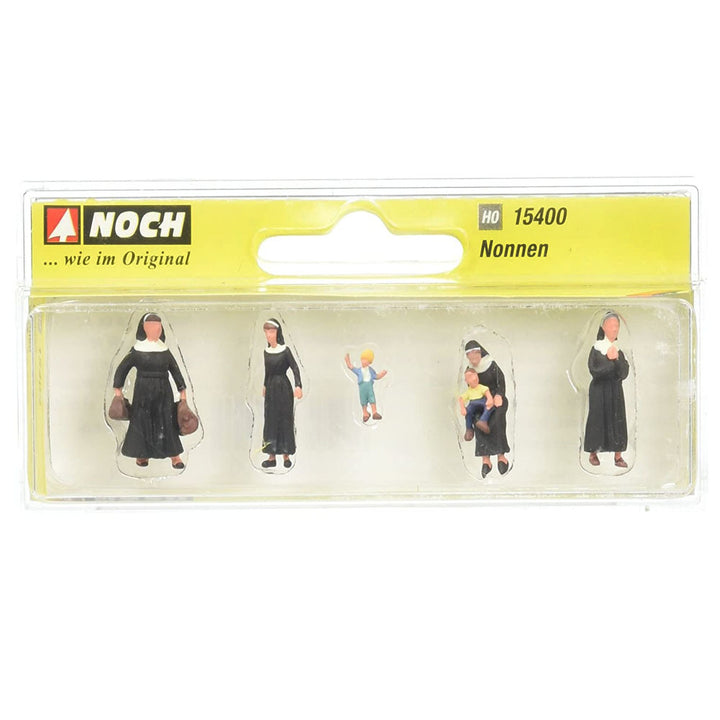 The nuns in their typical black-white habit have been missing in the NOCH model railway figures assortment. In the different religious communities the habit is worn either every day or only at festive church services. The nuns in the NOCH model are presented in daily situations: on the way with a bag, with a child on the hand or on the lap or in a praying position. Decorate your model railway layout with beautiful figures, such as warehousemen, carpenters, chimney sweepers and postmen, but also paramedics or policemen, who keep your model landscape in check. The assortment of figures leaves nothing to be desired and makes your landscape design a lot easier. Perfect for modelers who want to create realistic scenery and layouts be it for a model railway, architecture or any other scale model project layout.