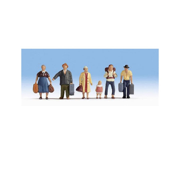 An elderly lady in a blue skirt and brown blouse is standing on the platform with two bags. A corpulent elderly gentleman in a grey suit and a hat is waiting for the train with his suitcase in hand. A grandmother in a coat and with a travel bag is travelling with her grandchild. A sporty young man with a large rucksack and a heavily laden man with two suitcases are also waiting for the train to arrive. The set is ideal for decorating station scenes on a model railway.