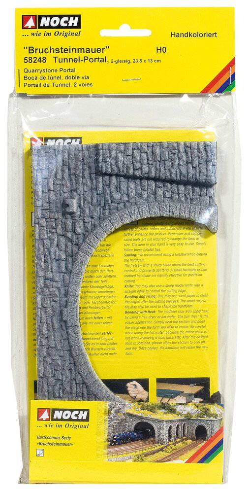 The Double-Track Tunnel Portal from the “Quarrystone Wall” hard foam series is ideal for designing realistic double-track tunnel and mountain entrances. The portal in H0 gauge (1:87 scale) doesn’t just shape the face of a railway landscape – in nature as well as in the model on your layout.