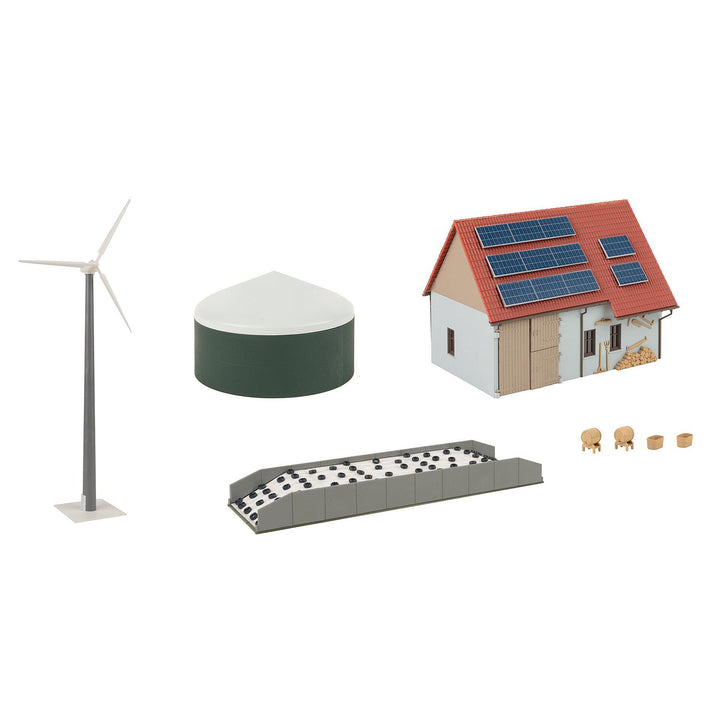 Welcome to the idyll of rural life! This set includes a rustic barn with traditional tools and modern solar cells on the roof as well as a spacious silo and a gas storage tank. An elegant wind turbine towers above the scenery and provides sustainable energy. This model building set combines traditional farming with the forward-looking power of modern technology and will make modellers' hearts beat faster. Contents: Barn, gas storage tank, mobile silo, wind turbine.