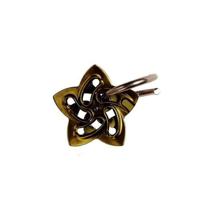 The grooves engraved in the two rotating boards are called “logarithmic spirals”. These Two grooves always cross at right angles, and a square hole is formed at their intersection. The goal of this puzzle is to remove the helix ring that goes through that hole. The inspiration for this puzzle is the morning glory. The puzzle was designed to look like a bud that comes into bloom with twining tendrils. The original concept dates back to 1990, but it has been enhanced with the addition of several tricky features.