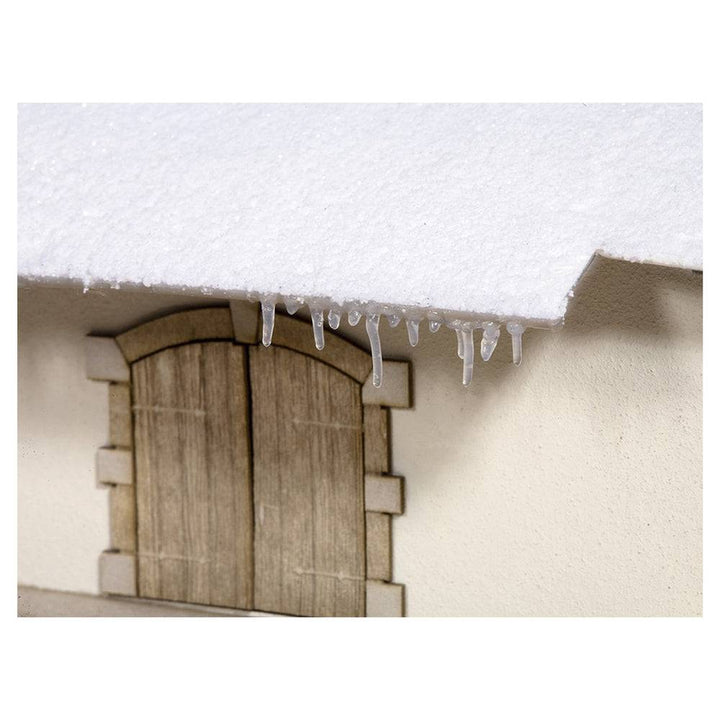 With NOCH Icilces, you can create atmospheric and unique icicles hanging from roof-tops, overlaps or bridges, in no time. The Iciles are dircetly applied from the tube to the surface of the object and it dries within 2 to 3 hours. Modelling the icicles is very easy: Just applied the tube's nozzle to the object from below and then press the tube while removing it from the object. This way you can decide on the icicles' length and width individually. You can create especially beautiful icicles, when you twist or turn the tube in spirals while doing so.