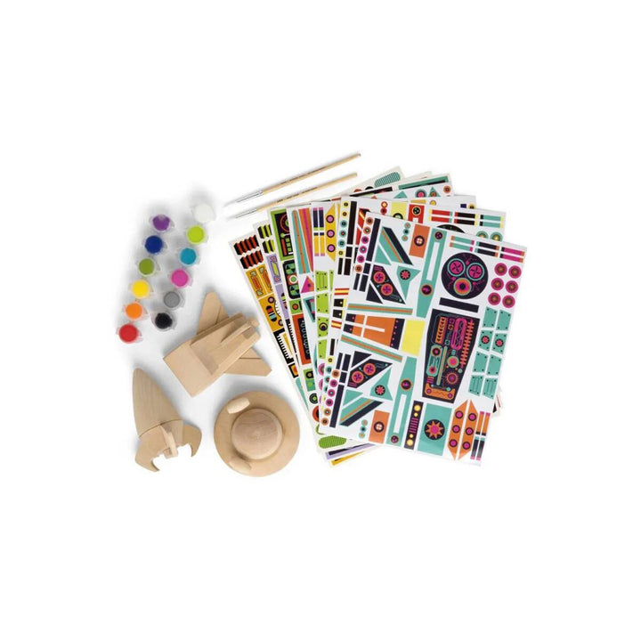 - Including various sticker sheets, acrylic paints, and paintbrushes, this Wooden spaceship kit lets your child easily create colourful, personalised spaceships.