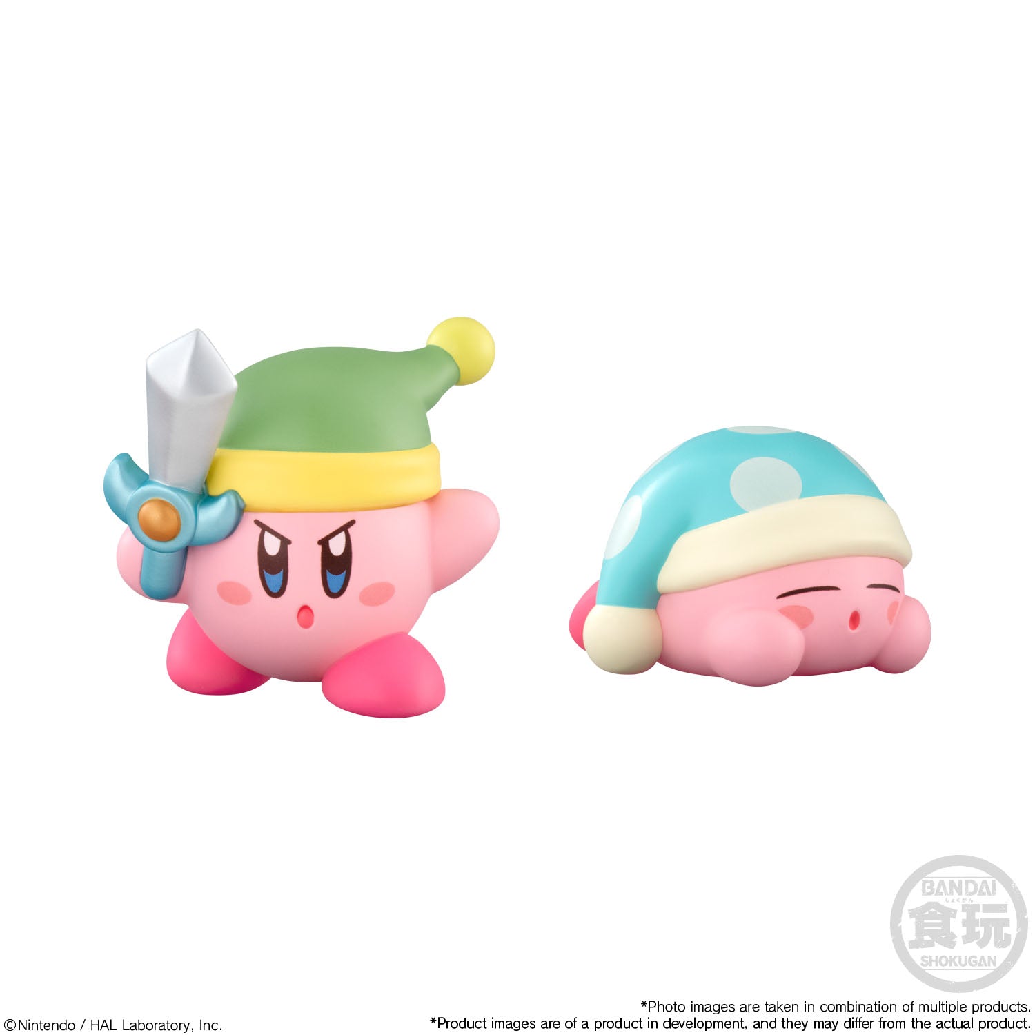 From Bandai Shokugan. New Shokugan figure collection featuring the Kirby in various adorable poses. Each character measures approximately 2 1/4" tall and is painted in pastel colors. There is even a secret color variation version of Kirby on Warp Star! Collect Kirby on Warp Star, Waddle Dee, Kirby with His Mouth Full, Kirby with Star Rod, Parasol Kirby, Beam Kirby, Sword Kirby, and Sleep Kirby!