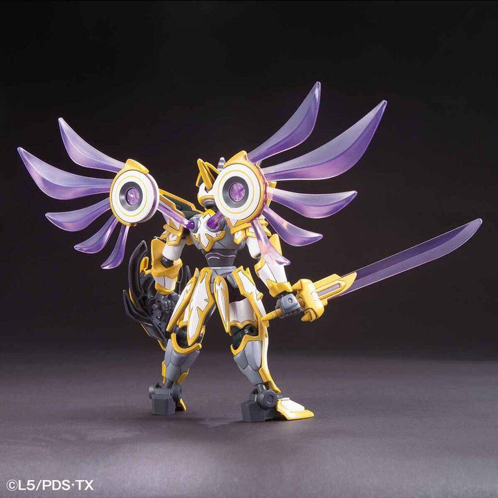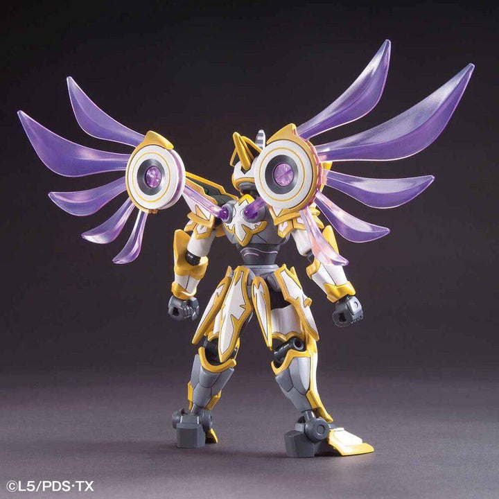 An LBX designed for Kutis Kole that uses a Knight Frame, it features a weapons called the "Edge of Heaven" sword and Nemesis Shield that reflects its angel-demon duality. This versions features new runners that enhance it's range of motion and colour separation. This plastic model kit from Bandai comes molded in separate colours, no paint required. Pieces are easy to snap together, so there is no glue required either.
